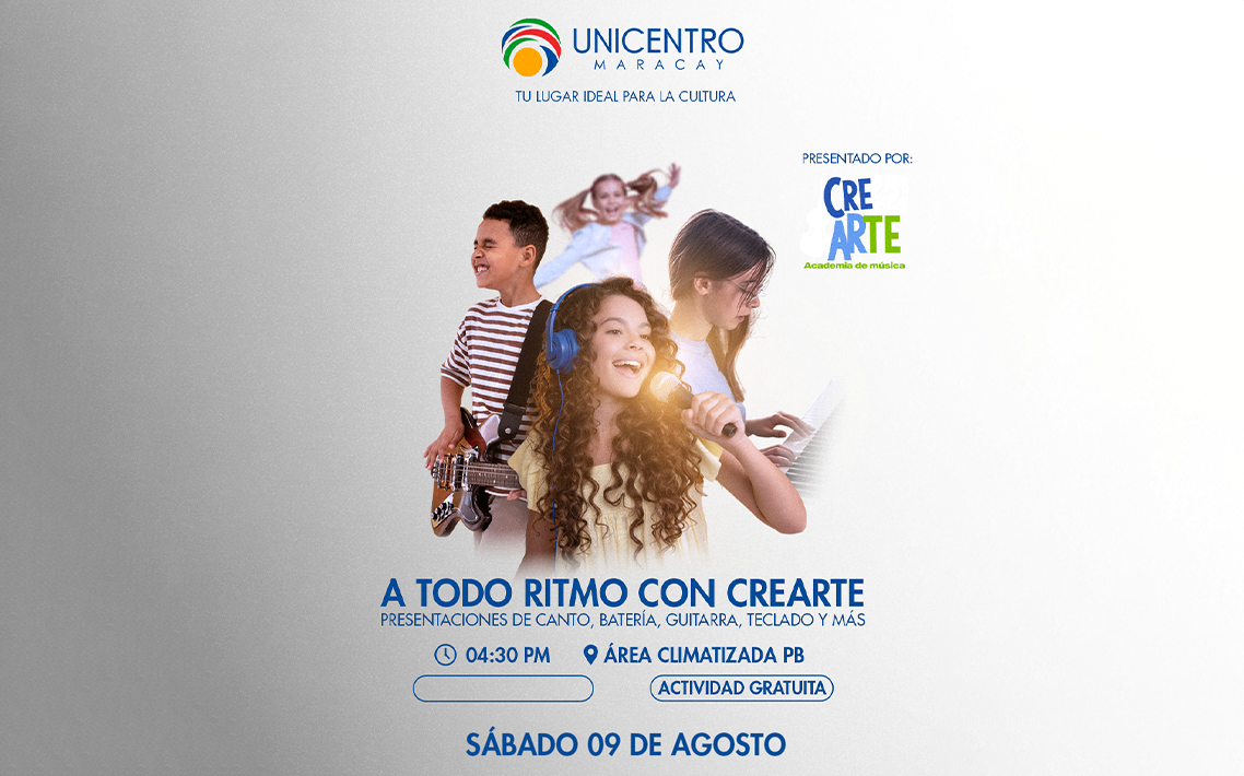 Ven a disfrutar del talento de los estudiantes de la @academia_crearte quienes darán una emocionante presentación con muestras de baile, canto acompañados de batería, guitarra y teclado 🎶🎤